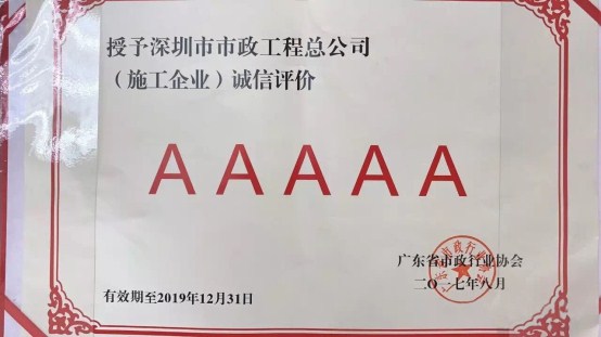 深圳市市政總公司獲得誠(chéng)信評(píng)價(jià)5A證書