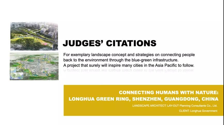 IFLA是受聯(lián)合國(guó)教科文組織指導(dǎo)的國(guó)際風(fēng)景園林行業(yè)影響力最大的國(guó)際學(xué)術(shù)最高組織。龍華環(huán)城綠道項(xiàng)目受到了IFLA評(píng)委會(huì)的高度稱贊,評(píng)委會(huì)在獲獎(jiǎng)評(píng)語(yǔ)中表示:項(xiàng)目利用藍(lán)綠生態(tài)空間,以堪稱典范的概念和策略,重新連接人與自然,讓高密度城市的人們回歸自然環(huán)境,龍華環(huán)城綠道一定會(huì)啟發(fā)更多亞太地區(qū)的城市來(lái)進(jìn)行效仿。