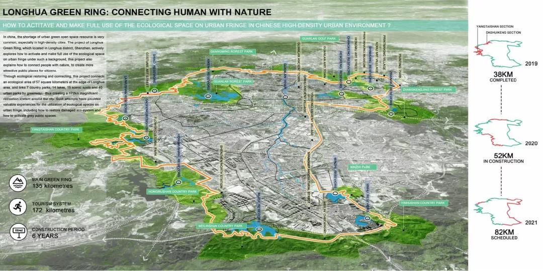 該項(xiàng)目以連接人與自然為理念,堅(jiān)持生態(tài)優(yōu)先、自然恢復(fù)、適度介入的原則,鏈接了 7 個(gè)郊野公園,14 個(gè)水庫(kù)湖泊,15個(gè)景區(qū),40 處城市公園,打造“最自然、最生態(tài)、最有趣”的郊野綠道,形成環(huán)繞龍華全城的連續(xù)活力風(fēng)景帶,項(xiàng)目結(jié)合了各個(gè)片區(qū)的自然景觀,旨在彰顯人與自然的完美融合,包容大山大水與人文體驗(yàn)。