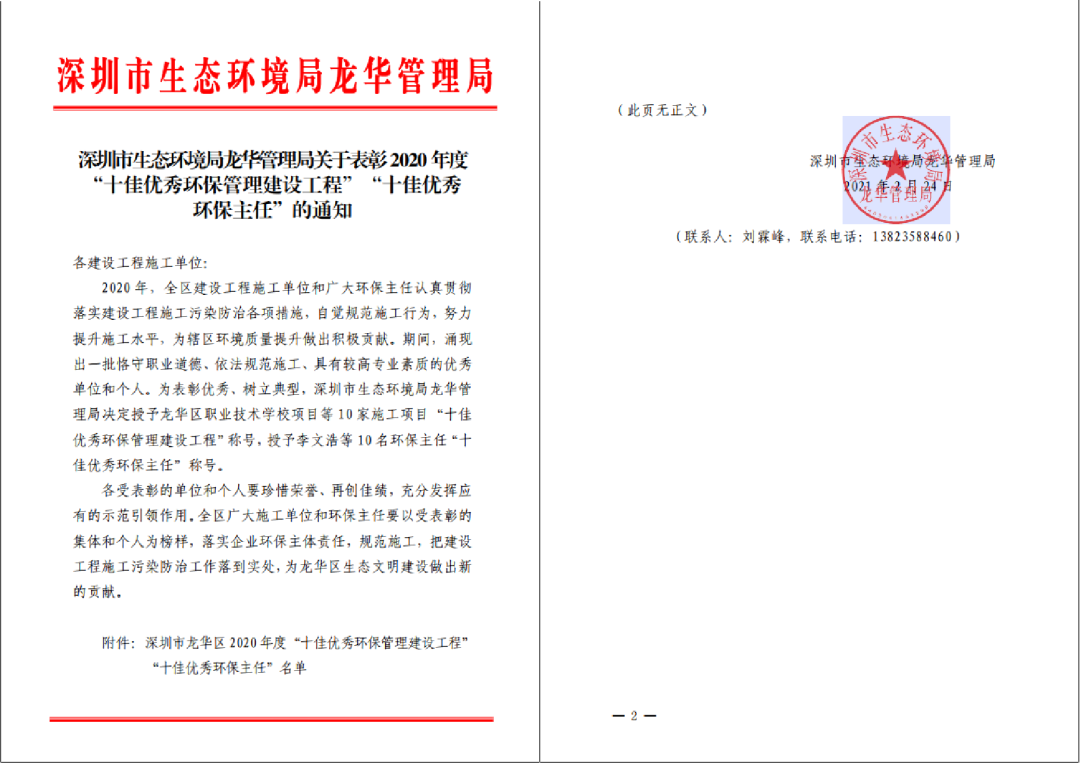 “十佳優(yōu)秀環(huán)保管理建設(shè)工程”、“十佳優(yōu)秀環(huán)保主任”評選,是深圳市龍華區(qū)為表彰過去一年中認(rèn)真貫徹落實(shí)建設(shè)工程施工污染防治各項(xiàng)措施,自覺規(guī)范施工行為,努力提升施工水平,為轄區(qū)環(huán)境質(zhì)量提升做出積極貢獻(xiàn)的優(yōu)秀單位和個(gè)人,每年評選10個(gè)施工項(xiàng)目和10名環(huán)保主任,并授予榮譽(yù)稱號(hào)。天健二建公司歷來高度重視項(xiàng)目建設(shè)過程中的環(huán)保管理工作,在各項(xiàng)目部成立環(huán)保工作小組,健全環(huán)保管理制度,層層壓實(shí)崗位職責(zé),標(biāo)準(zhǔn)化、規(guī)范化推進(jìn)各項(xiàng)污染防治舉措,全面提升項(xiàng)目管控水平,確保項(xiàng)目建設(shè)期間不造成廢水、廢渣、揚(yáng)塵、噪音等環(huán)境污染和擾民現(xiàn)象,推動(dòng)項(xiàng)目生態(tài)和諧發(fā)展,為項(xiàng)目獲得表彰打下堅(jiān)實(shí)基礎(chǔ)。