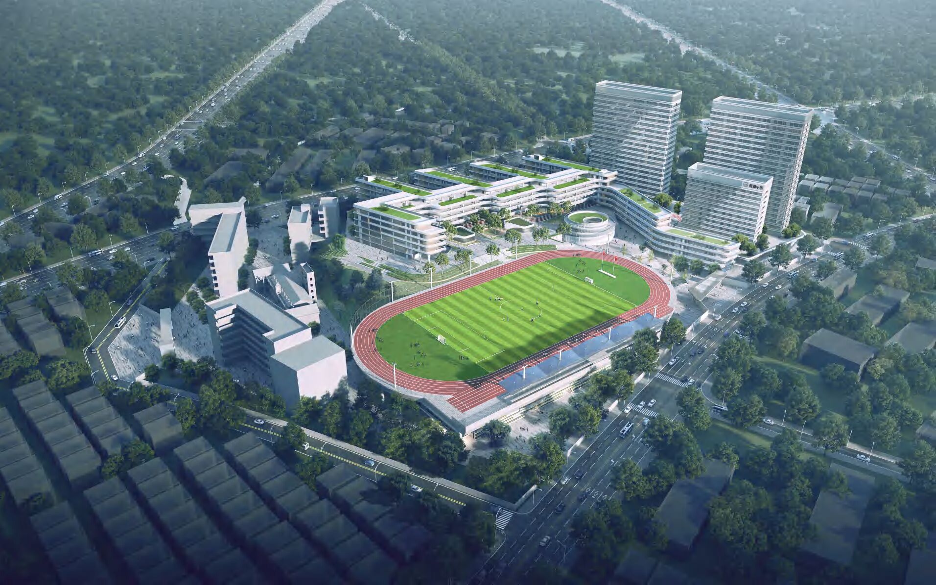 項(xiàng)目位于觀湖街道觀平路西北側(cè),場(chǎng)地西側(cè)鄰近東王幼兒園,其余側(cè)邊位于校內(nèi)空曠區(qū)域,項(xiàng)目用地面積約73824㎡,框架剪力墻結(jié)構(gòu),擬建高中60班,初中36班,總建筑面積132825㎡,新增面積約111825㎡,本次改擴(kuò)建新增主要功能用房包括教輔和辦公樓、生活用房和架空層、微格教室、游泳館、教工宿舍、地下車庫(kù)和設(shè)備房等內(nèi)容,以及運(yùn)動(dòng)場(chǎng)、道路廣場(chǎng)綠化等室外設(shè)施。