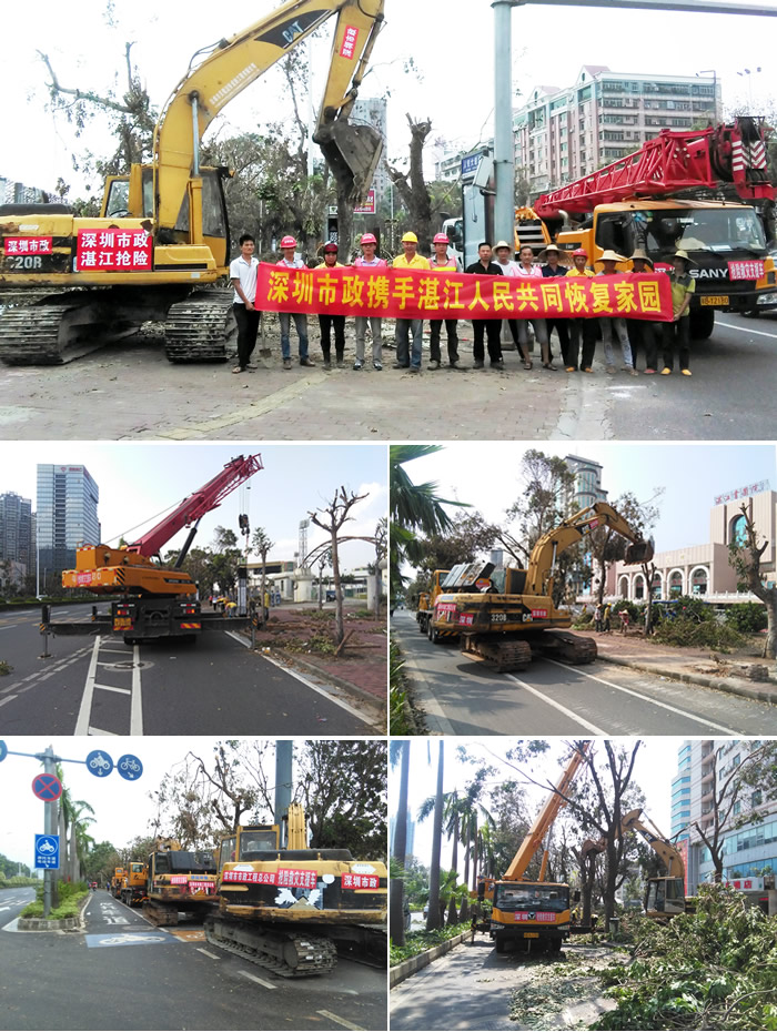 2015年10月4日,強(qiáng)臺(tái)風(fēng)“彩虹”從粵西登錄,夾雜著狂風(fēng)暴雨,導(dǎo)致湛江市區(qū)一片狼藉,10月6日晚23點(diǎn)左右,接深圳市住建系統(tǒng)領(lǐng)導(dǎo)通知指示,市政總積極響應(yīng),公司領(lǐng)導(dǎo)立刻做出安排,瀝青公司出動(dòng)CAT挖機(jī)一臺(tái),拖車(chē)一臺(tái),安裝公司出動(dòng)CAT挖機(jī)一臺(tái),于7日凌晨1:30分左右,從光明及石巖出發(fā),日夜兼程,第一時(shí)間到達(dá)指定集合地點(diǎn),并與當(dāng)?shù)貙?duì)接部門(mén)城市綜合管理局相關(guān)現(xiàn)場(chǎng)負(fù)責(zé)人員取得聯(lián)系,等候統(tǒng)一安排。