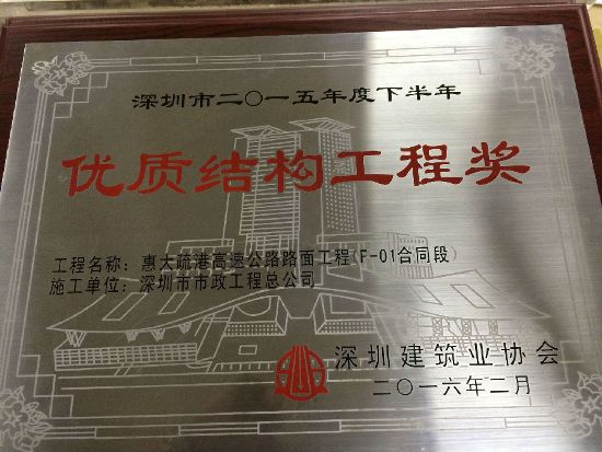 由深圳市市政工程總公司組織施工的惠大疏港高速公路路面工程(F—01合同段)榮獲2015年度下半年深圳市優(yōu)質(zhì)結(jié)構(gòu)工程獎。