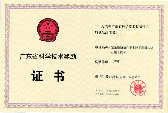 2016年2月4日,廣東省人民政府發(fā)布了《廣東省人民政府關(guān)于頒發(fā)2015年度廣東省科學(xué)技術(shù)獎(jiǎng)的通報(bào)》(粵府[2016]10號(hào)文),深圳市市政工程總公司的科技成果——“復(fù)雜地質(zhì)條件下土壓平衡盾構(gòu)綜合施工技術(shù)”喜獲2015年度廣東省科學(xué)技術(shù)獎(jiǎng)二等獎(jiǎng),這是時(shí)隔5年我公司第二次獲得廣東省人民政府頒發(fā)的科學(xué)技術(shù)獎(jiǎng)二等獎(jiǎng)。該獎(jiǎng)項(xiàng)的獲得提高了我公司在地鐵盾構(gòu)工程領(lǐng)域的知名度和影響力,可為今后承接同類(lèi)工程提供有力的技術(shù)支持。