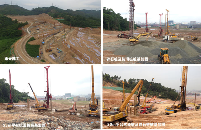 與現(xiàn)場道路泥濘不堪、作業(yè)環(huán)境惡劣相比,要在年關(guān)找到靠得住的施工隊伍并留住他們才是最為困難的。而搶險工程不同于其他普通項目可以有更多的時間籌措施工和通過招標(biāo)來挑選施工班組,擺在我們面前的是業(yè)主要求能盡快進場施工,因為滑坡殘留在坑體周邊的余泥渣土拉裂嚴重、坑體內(nèi)土體含水飽和,即便有輕微的坍塌就存在坑體土方二次滑移的風(fēng)險。為確保安全消除隱患,項目管理團隊依靠自身優(yōu)勢,采取經(jīng)濟獎勵、提高工程單價及簡化招標(biāo)流程等措施,利用施工隊伍長期合作關(guān)系調(diào)動一切社會資源,利用三天時間就落實下1個旋挖機隊伍、2臺碎石樁機以及20多臺推土機和挖掘機進駐施工現(xiàn)場準備跨年作業(yè)。