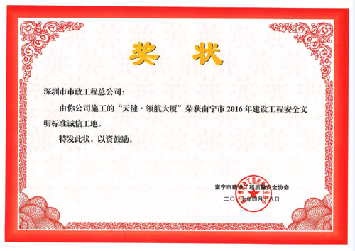 天健.領(lǐng)航大廈榮獲“南寧市2016年建設(shè)工程安全文明標(biāo)準(zhǔn)誠(chéng)信工地”稱號(hào)