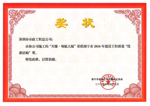 天健.領(lǐng)航大廈榮獲“南寧市2016年建設(shè)工程質(zhì)量?jī)?yōu)質(zhì)結(jié)構(gòu)獎(jiǎng)”