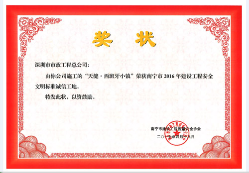 天健.西班牙小鎮(zhèn)榮獲“南寧市2016年建設(shè)工程安全文明標(biāo)準(zhǔn)誠(chéng)信工地”稱號(hào)