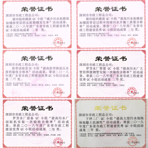 二等獎:《減少舊水泥路面加鋪瀝青層的反射裂縫發(fā)生率》、《提高舊水泥路面加鋪瀝青層過程中的雨霧水井施工質(zhì)量合格率》、《提高瀝青路面壓實(shí)度的驗(yàn)收合格率》、《提高污水廠大管徑焊接鋼管安裝一次驗(yàn)收合格率》、《提高污水廠刮泥機(jī)安裝一次驗(yàn)收合格率》、《提高大型污水池池體混凝土抗?jié)B性》