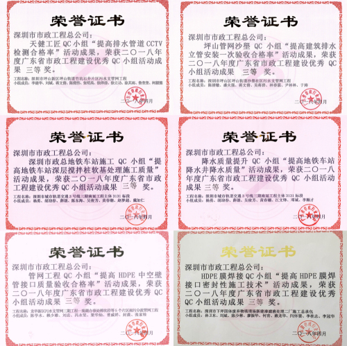 三等獎:《提高HDPE膜焊接口密封性施工技術(shù)》、《提高HDPE中空壁管接口質(zhì)量驗(yàn)收合格率》、《提高地鐵車站降水井降水質(zhì)量》、《提高建筑排水立管安裝一次驗(yàn)收合格率》、《提高地鐵車站深層攪拌樁軟基處理施工質(zhì)量》、《提高排水管道CCTV檢測合格率》